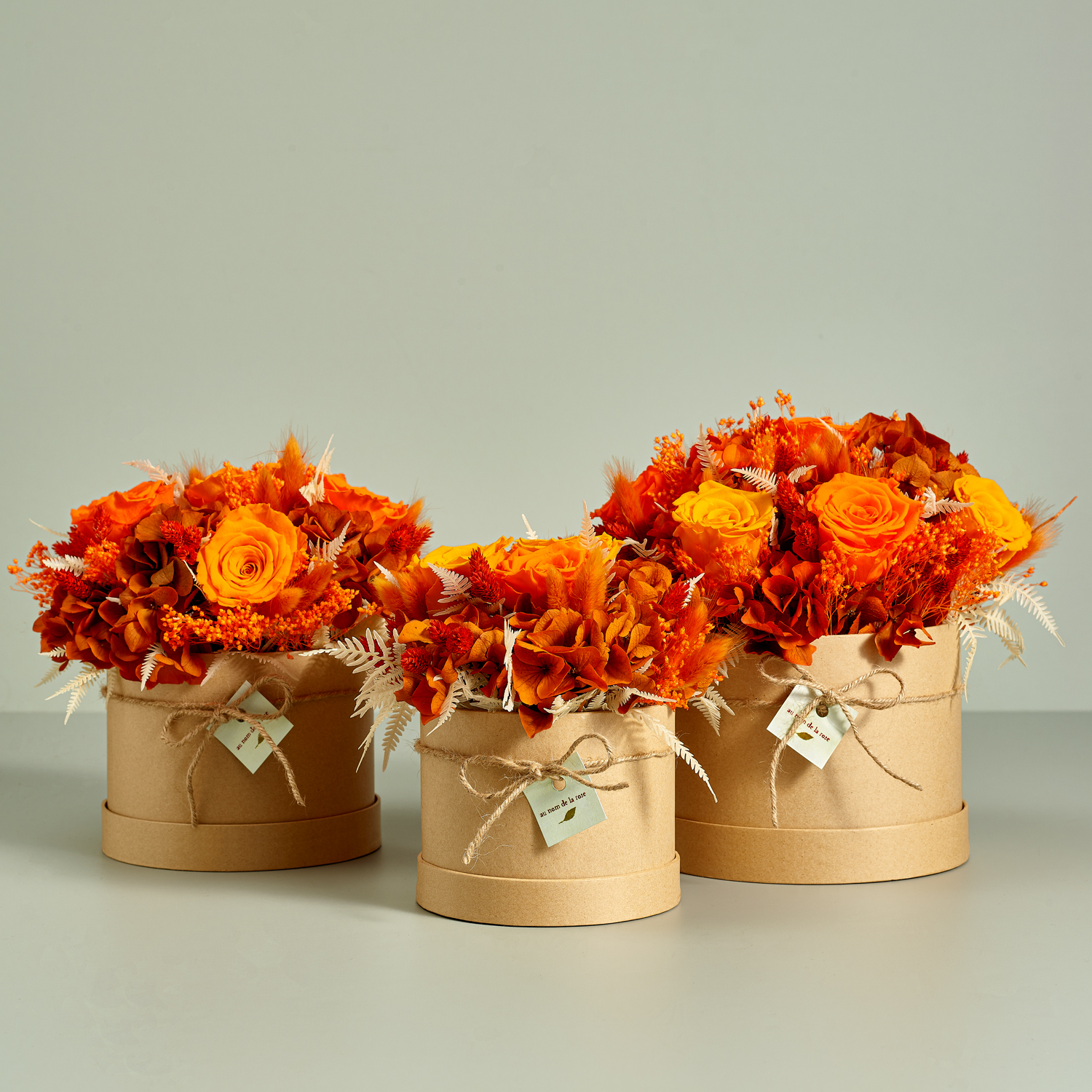 Realizzata a mano dai fioristi di Au nom de la rose in tre dimensioni e sei eleganti sfumature.