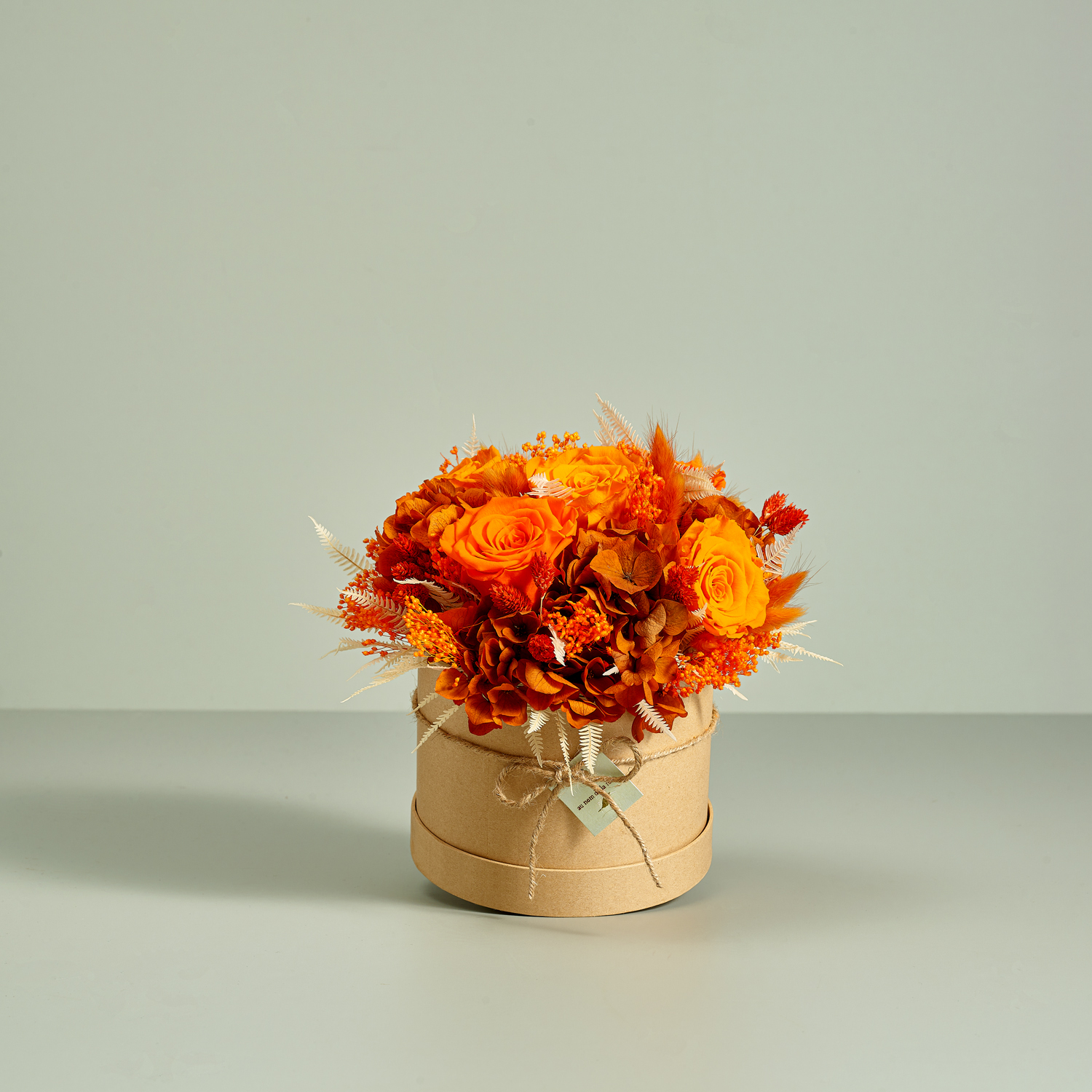 Un fiabesco valzer di fini rose stabilizzate e fiori essiccati si sviluppa su una raffinata cappelliera in cartone naturale color avana.