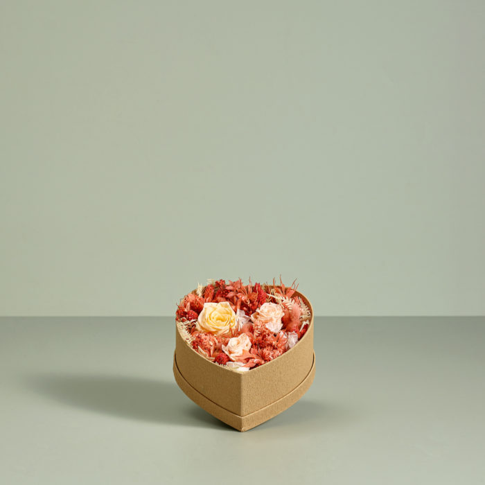 Fini rose stabilizzate si sposano con pregiati fiori essiccati in un romantico scrigno in cartone naturale a forma di cuore.