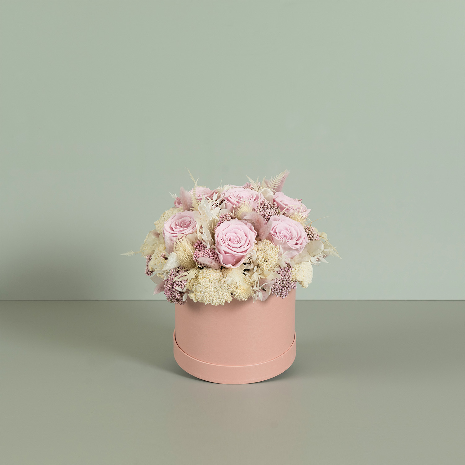 Un fiabesco valzer di fini rose stabilizzate e fiori essiccati si sviluppa su una raffinata cappelliera in pregiato cartone perlato.